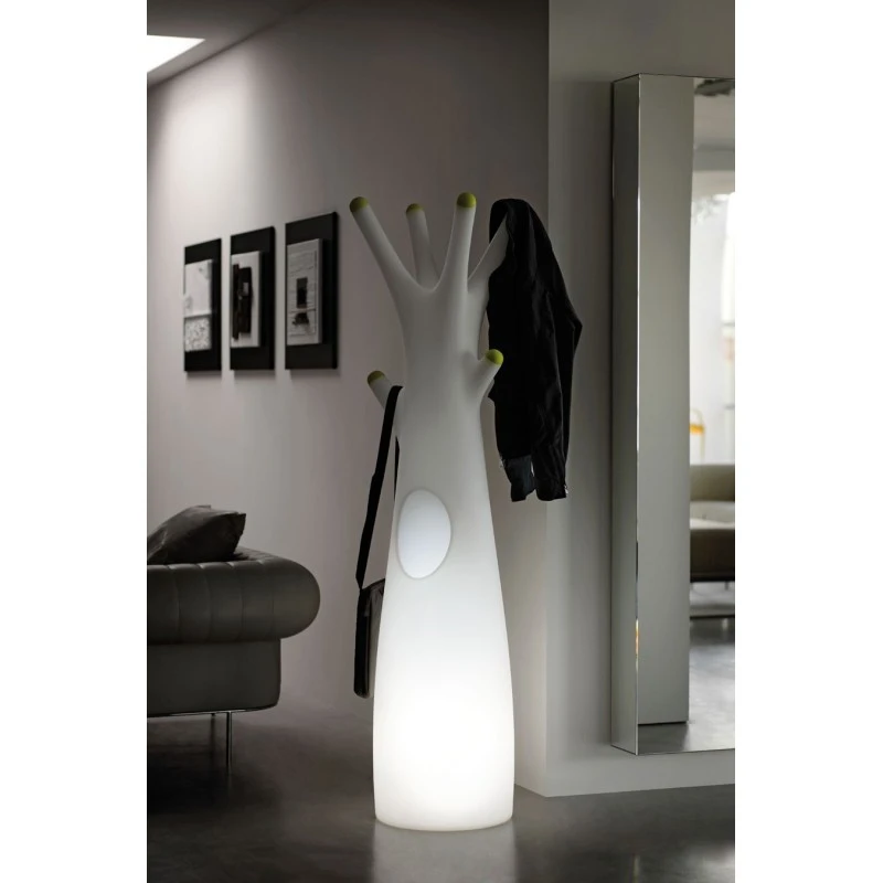 Nella struttura dell’Appendiabiti Godot Plust illuminabile vi è un comodissimo vano portaoggetti ed è accessoriato con 6 appendici disponibile in: