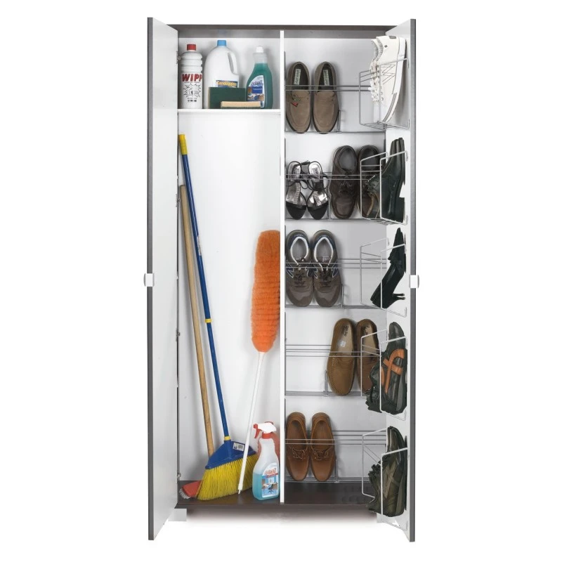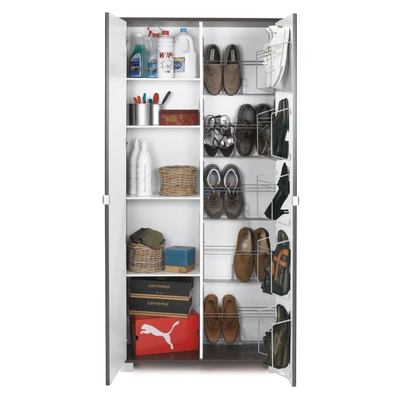 Struttura in legno nobilitato sp. 20mm e ante sp. 16mm, bordo PVC senza angolo vivo. Interno con 1 lato con 4 ripiani regolabili ed 1 lato con griglie portascarpe sull’anta e sulla schiena. Maniglie e piedini verniciati cromo satinato.