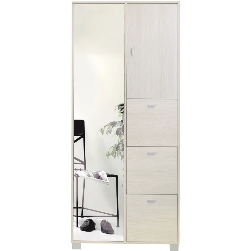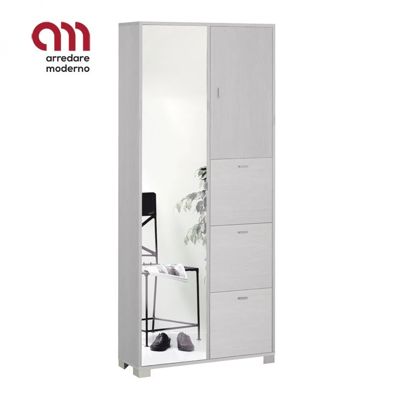 Struttura in legno nobilitato ed ante sp. 16mm. Maniglia in alluminio su anta a specchio. Maniglie e piedini cromo satinato. Interno 4 ripiani regolabili e griglie portascarpe. Capienza 12 paia. Accessori per attacco a parete inclusi