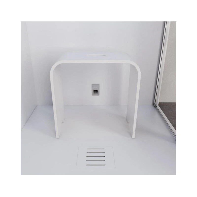 Box doccia in PlyLite bianco opaco materico per installazione ad angolo, composto da piatto doccia H 3cm, parete di fondo, parete attrezzata e tettuccio con soffione