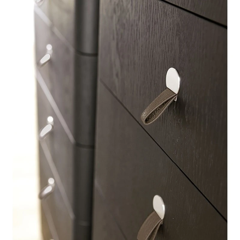 Cassetti con guide metalliche frenati e maniglie in pelle in tinta con il piano.