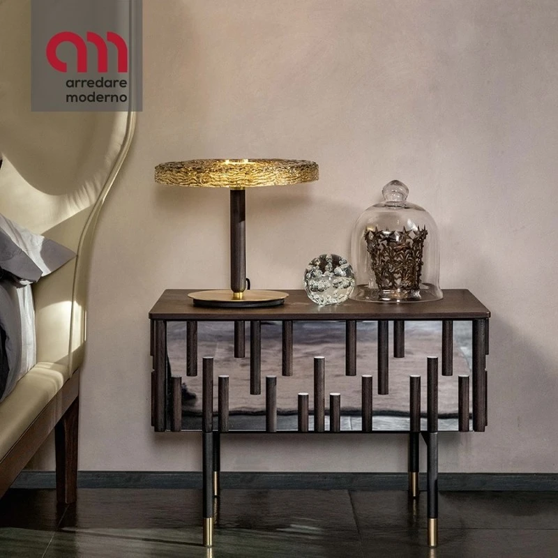 Drops di Tonin Casa è un comodino in legno, con 1 cassetto/ante effetto specchio e base in metallo. Ideale per riporre oggetti in maniera ordinata.