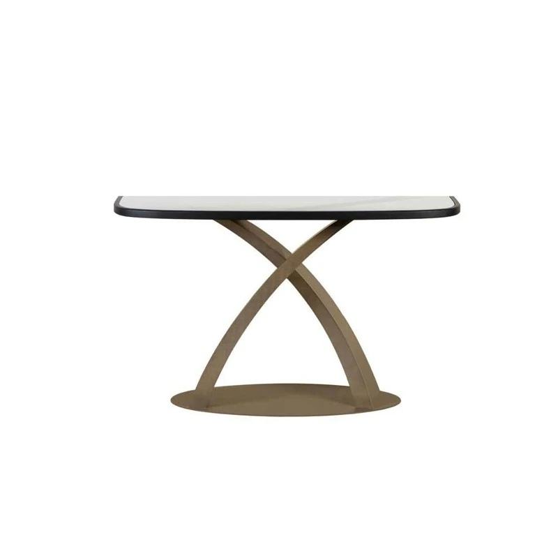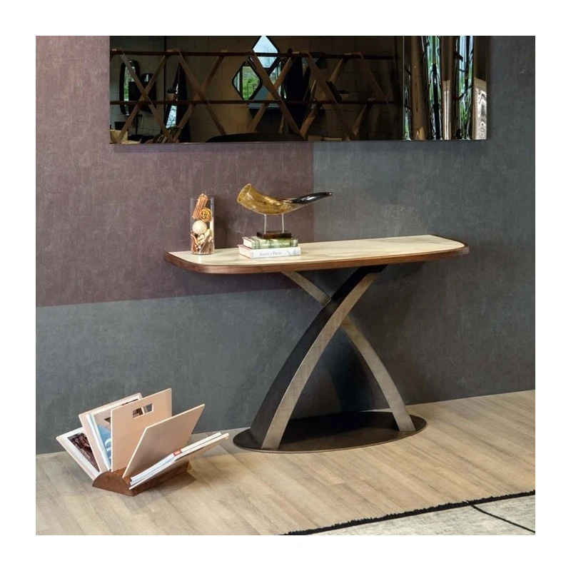 La consolle Eliseo Élite di Tonin di stile moderno si caratterizza per le sue linee leggere ed avvolgenti, con base in acciaio verniciato in diverse finiture e piano in gres porcellato con bordino in legno. Ideale per arredare la tua zona indoor moderno.