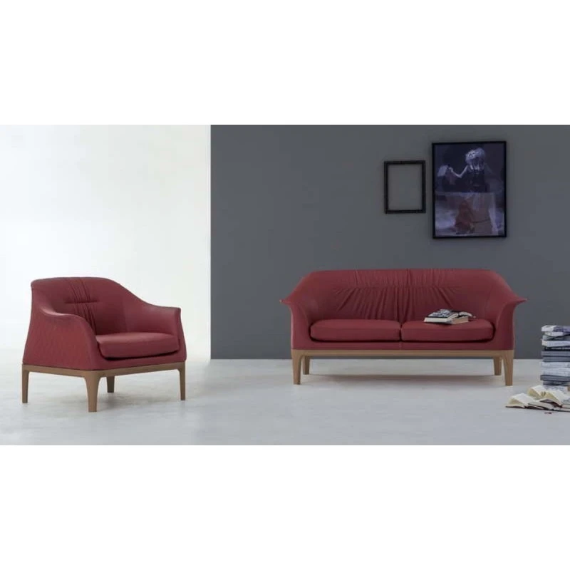 Un divano che si ispira ad un lusso morbido e delicato: il legno di frassino, in finitura noce Canaletto, rovere scuro, o rovere naturale, si abbina lieve al rivestimento in pelle ed eco-pelle, in tutte le colorazioni disponibili.
