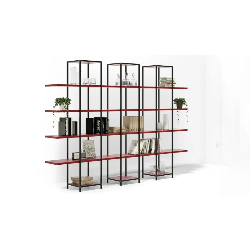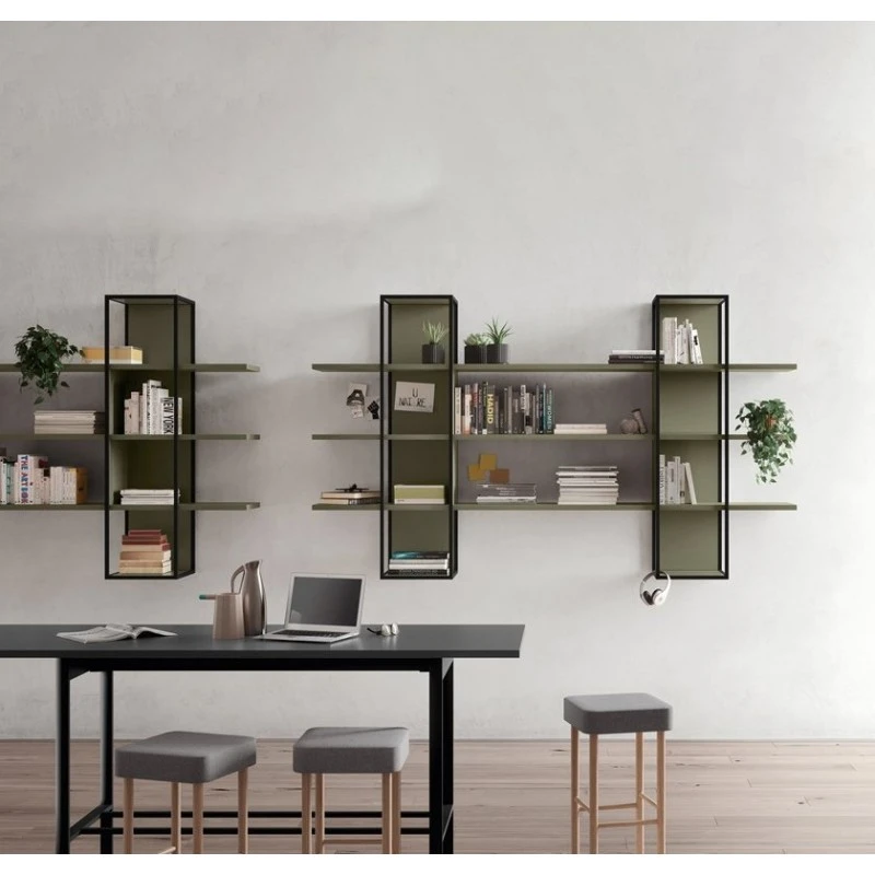Questa soluzione è ricavata da quella precedente con l’unica variante che le strutture sono prive di piedini e non sono appoggiate a terra, ma sono appese a parete. I telai della libreria vengono fissati a parete mediante apposite viti e tasselli; sono disponibili tasselli per cartongesso. In questa versione è obbligatorio inserire dei fianchi fra telaio e mensole in modo da evitare eventuali flessioni dei telai.