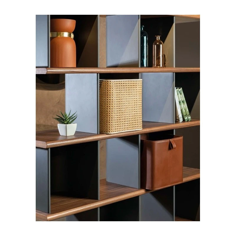 Libreria Kaspar di Tonin Casa si presenta con un design moderno caratterizzata dalla struttura in legno curvato in diverse finiture, che si impreziosisce con ceste in cuoio o paglia di Vienna. Utilizzabile anche come divisorio per il tuo ambiente interno, formando una vera parete.