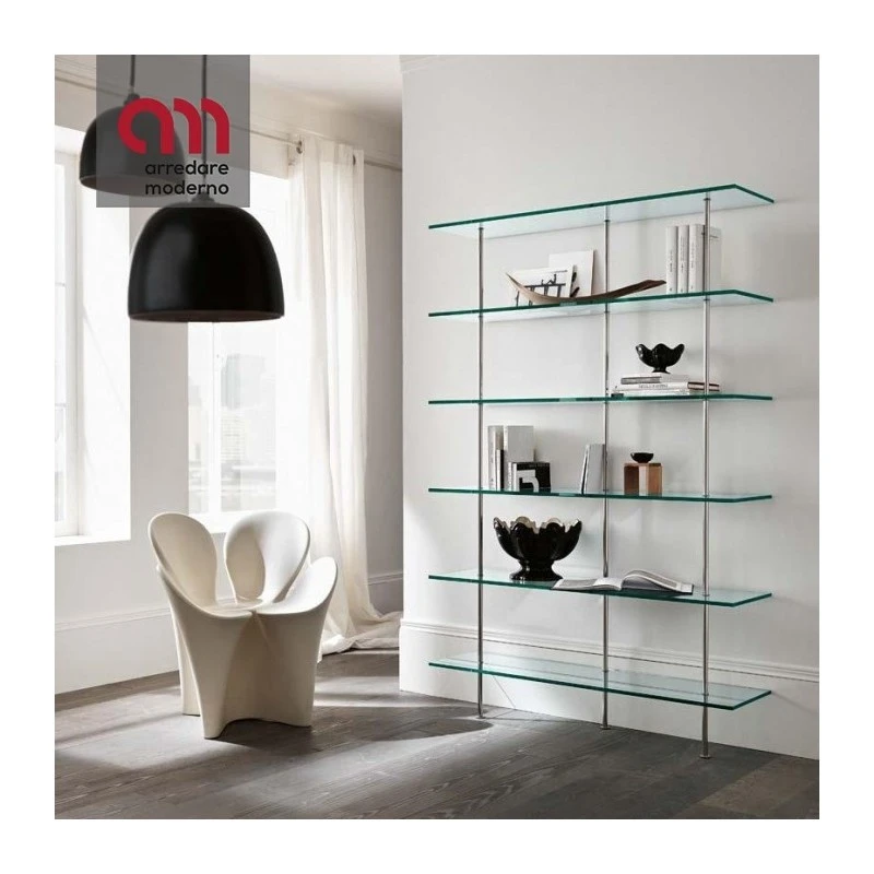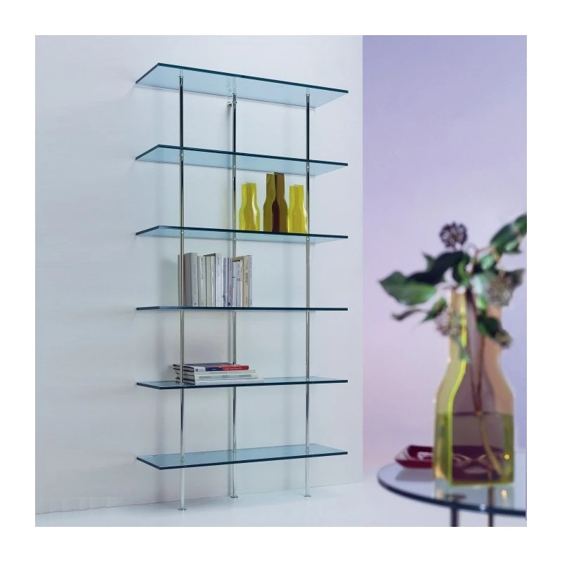 Trasparenza è un mobile a parete con supporti in metallo inox lucido e ripaini in vetro trasparente. Disponibile in diverse dimensioni di altezza e larghezza, nella versione 5 o 6 ripiani.