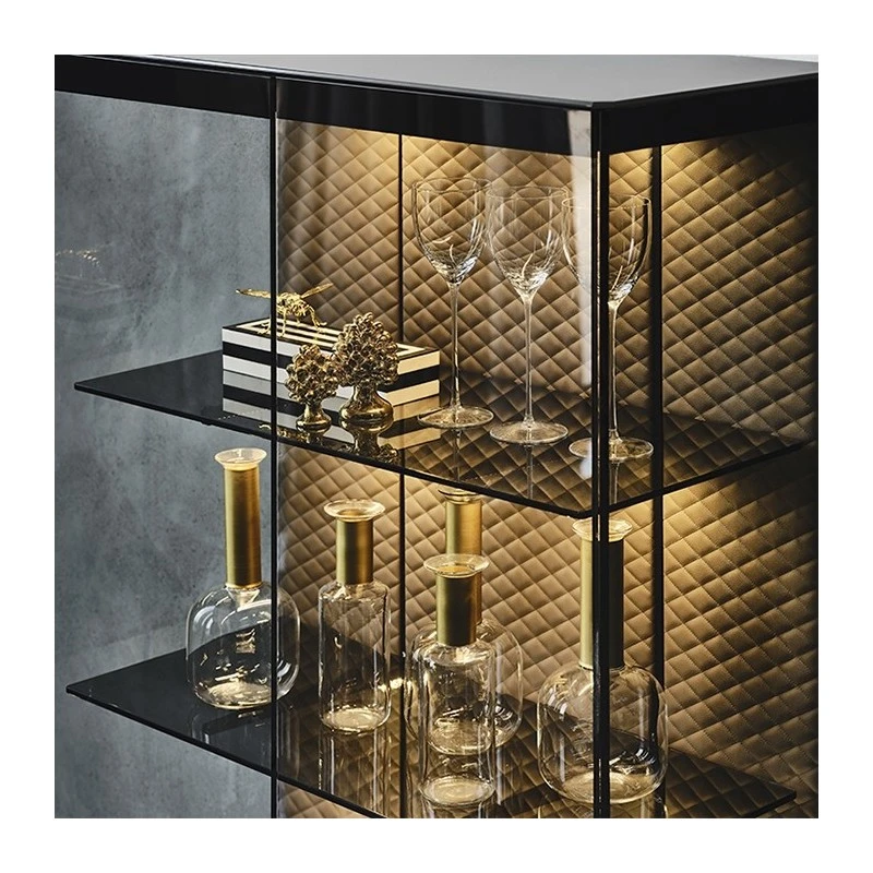 Ante e fianchi realizzati in cristallo fumè con fasce in cristallo verniciato nero.