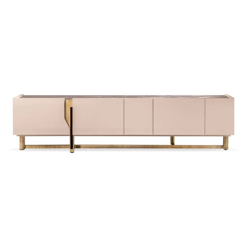 Il Porta TV Mirage di Cantori è una raffinata soluzione d’arredo caratterizzata da quattro ante. La sua struttura, realizzata in legno laccato, offre una base unica in metallo scavato e ribattuto internamente. Il piano può essere arricchito con marmo o rivestimento a scelta. L’originale apertura delle ante laterali verso l’esterno svela un interno laccato a contrasto nel suggestivo colore “Terra di Marocco”. Questo gioco di pieni e vuoti, con finiture contrastanti, crea un’atmosfera unica che enfatizza le forme geometricamente pure del mobile, alternando luci e ombre in modo accattivante.
