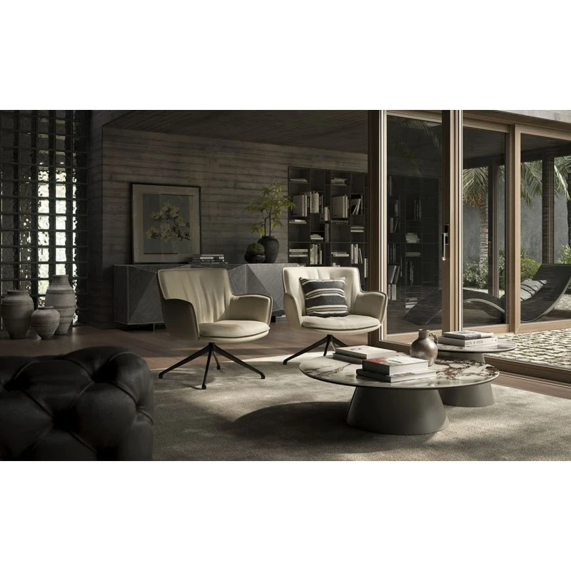 Poltrona Rhonda, è caratterizzata per l’eleganza naturale adatta ad completare una sala da pranzo di design comfort. Rhonda Lounge con la sua ampia seduta tondeggiante e la sua base girevole viene definita una poltrona dalla “figura generosa”. Nella parte bassa del retro schienale, la struttura e l’innesto delle gambe, sottolineano la morbidezza delle linee di queste sedie moderne. La famiglia Rhonda è l’ideale fusione tra “eleganza e praticità.