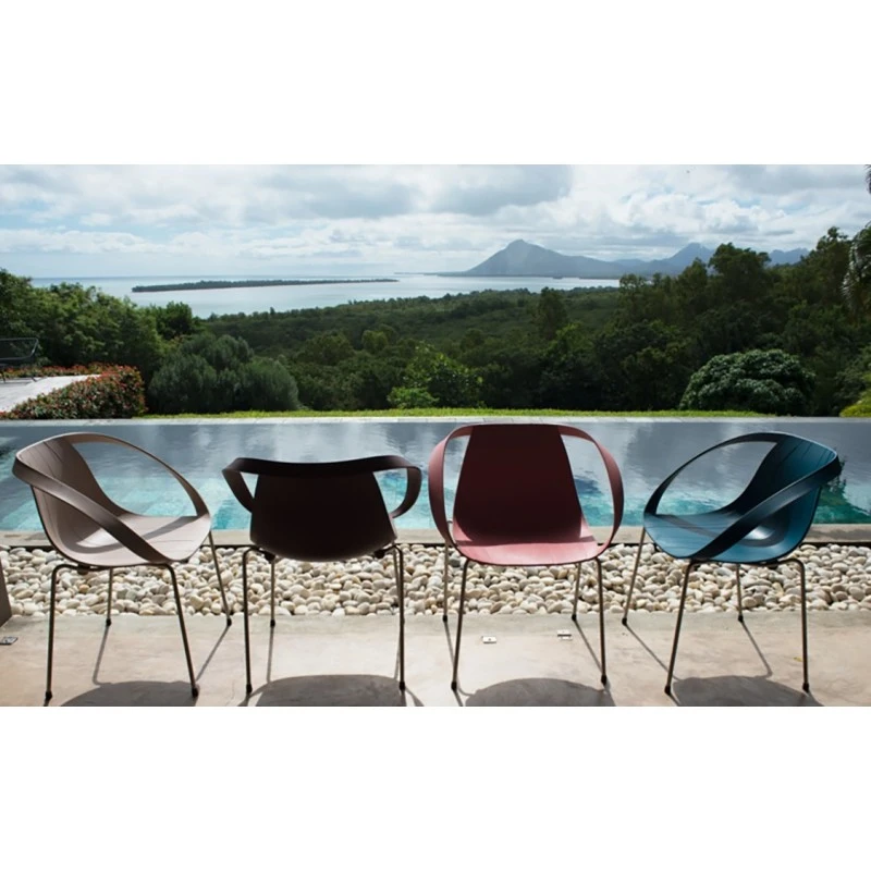 Il basamento della poltroncina è in tubo d’acciaio disponibile nelle finiture: