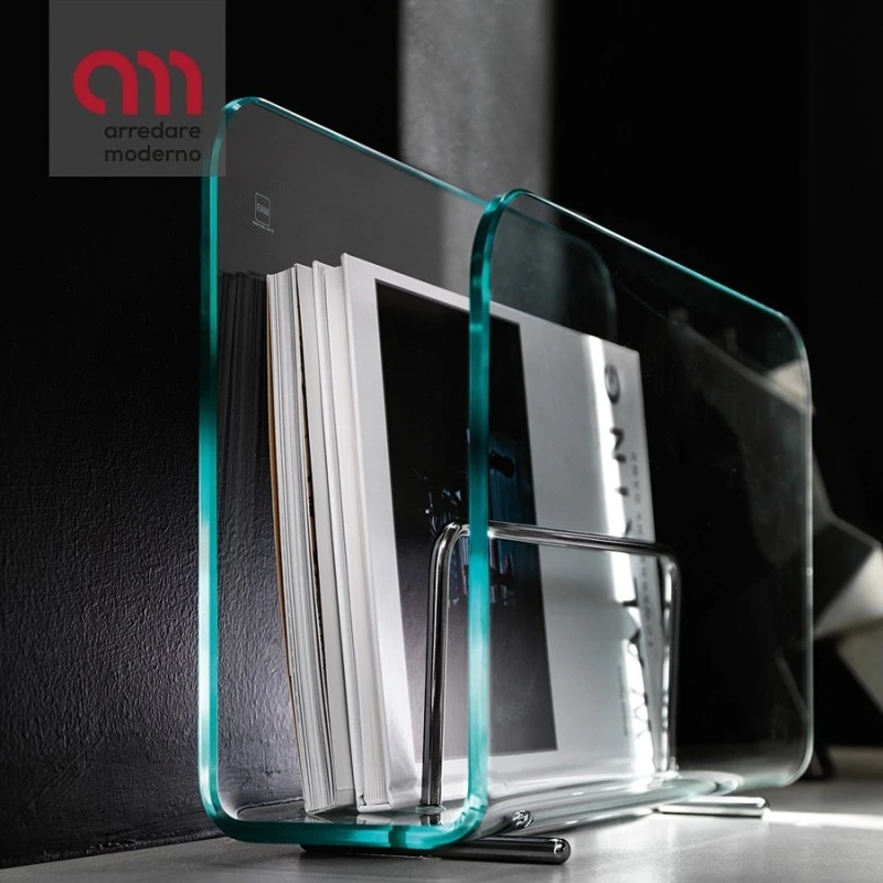 Portariviste in vetro trasparente curvato da 10 mm con appoggi in acciaio cromato.