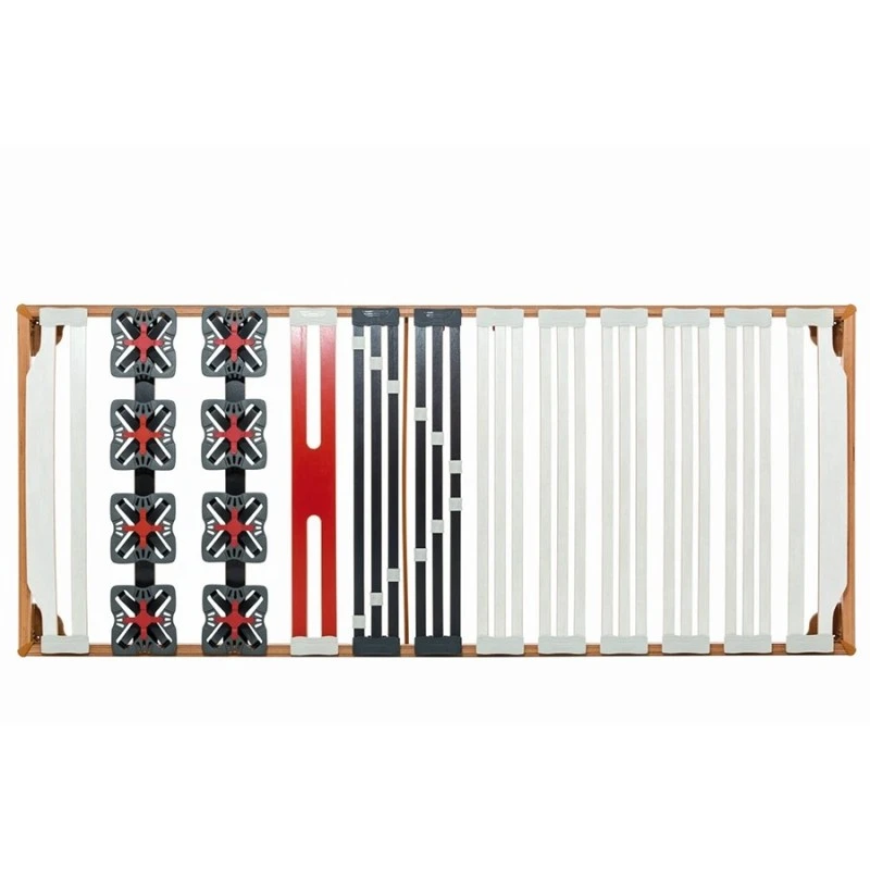 nella zona del bacino le doghe in legno sono accessoriate di regolatori di rigidità ad anello che consentono di regolare la portanza, questo sistema funziona come una balestra, spostando gli anelli dal centro verso l’esterno si aumenta la rigidità;