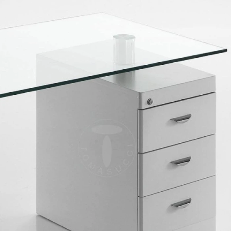 Scrivania piano in vetro curvato sp. 12 mm, cassettiera con serratura e 3 cassetti ad estrazione totale realizzata in MDF laccata bianco opaco. Schienale cassettiera laccato bianco opaco. Cilindro di collegamento in metallo cromato.