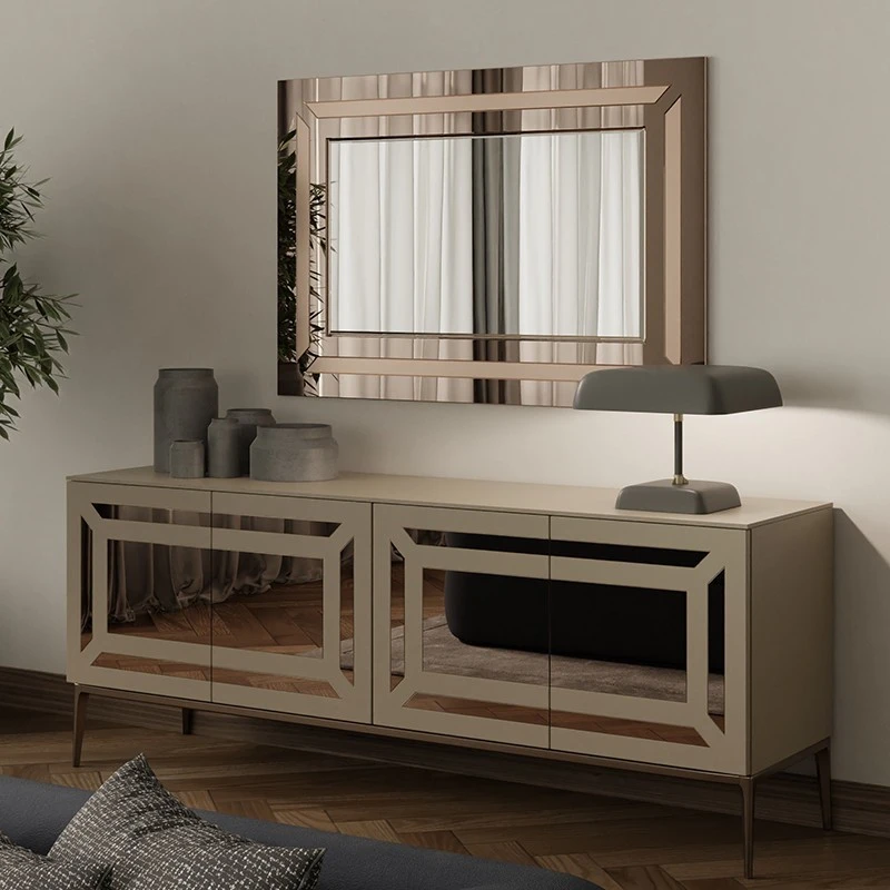 Lo specchio Andrea di Zamagna Italia è un complemento d’arredo elegante e funzionale, ideale per arricchire ambienti moderni con un tocco di raffinatezza. Di forma rettangolare, presenta una cornice in specchio bronzato con inserti in vetro sabbiato bronzo, creando un gioco di luci e riflessi che dona profondità e luminosità agli spazi.