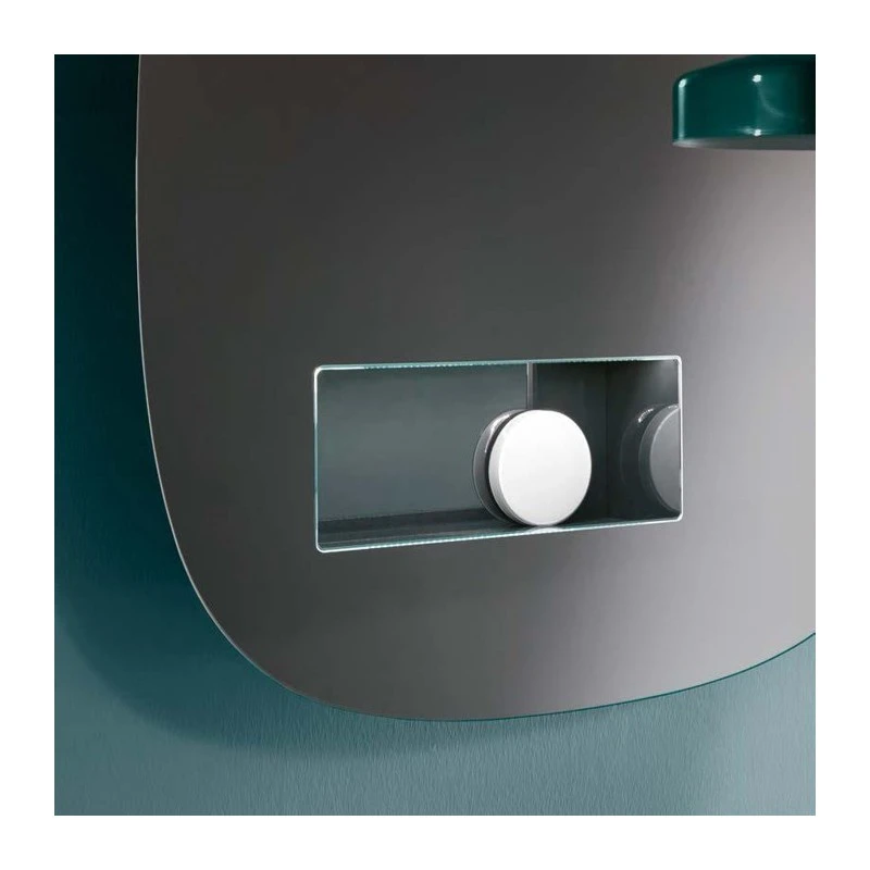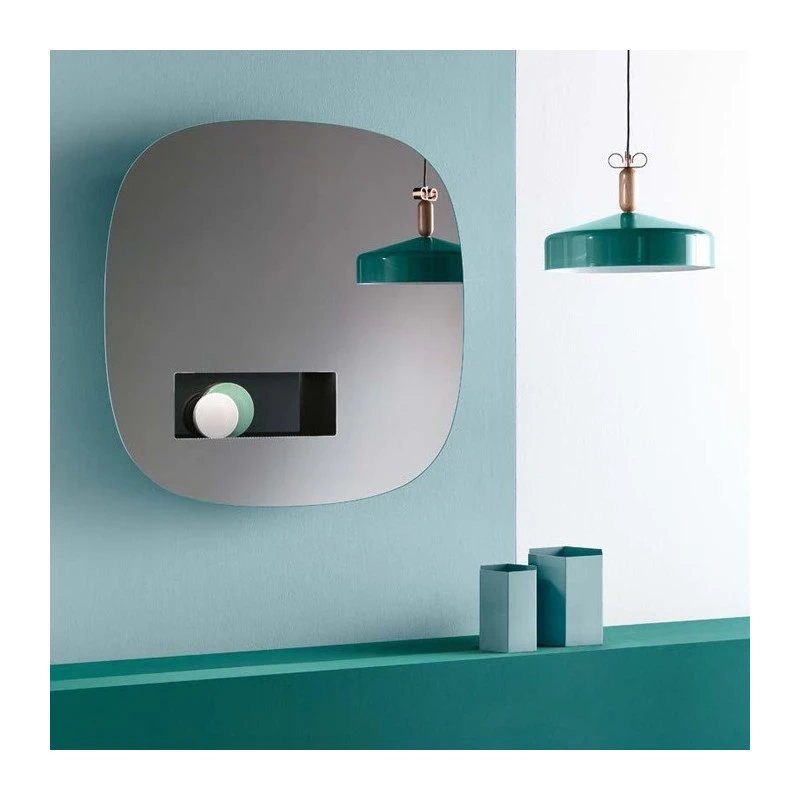 Specchio da parete disegnato da Karim Rashid con bordi arrotondati e vano portaoggetti incorporato che include una luce a LED che si auto attiva grazie ad un rilevatore di movimento. Disponibile in due dimensioni