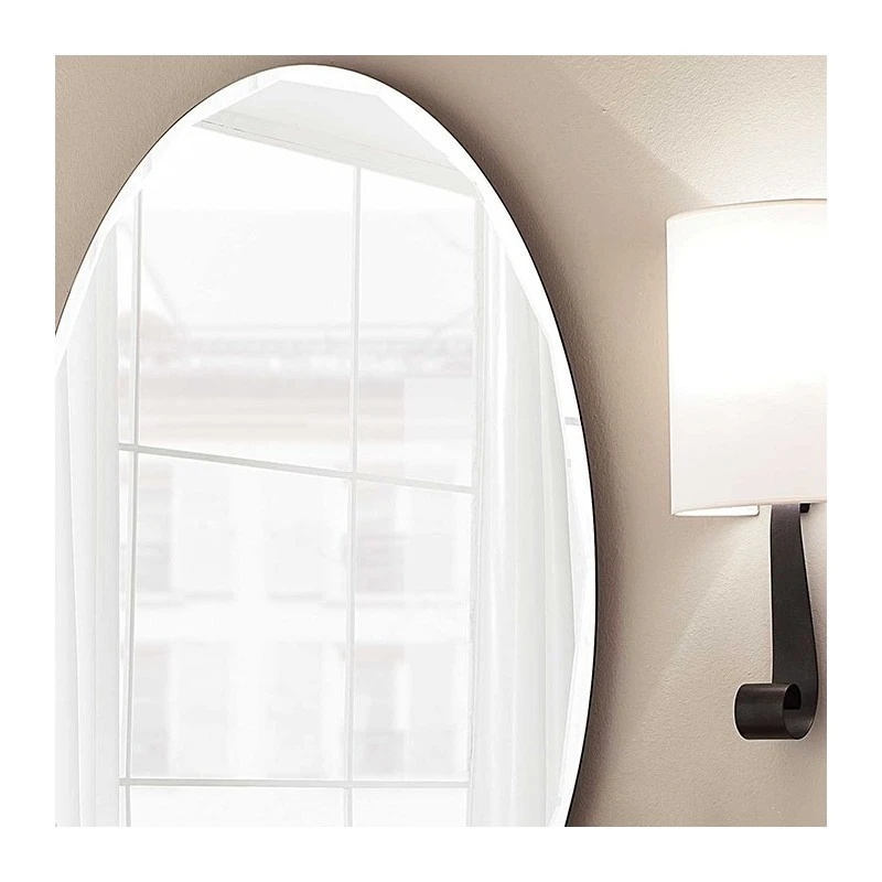 Ovale, specchio argentato. Spessore di 6mm. Supporto in legno pantografato.