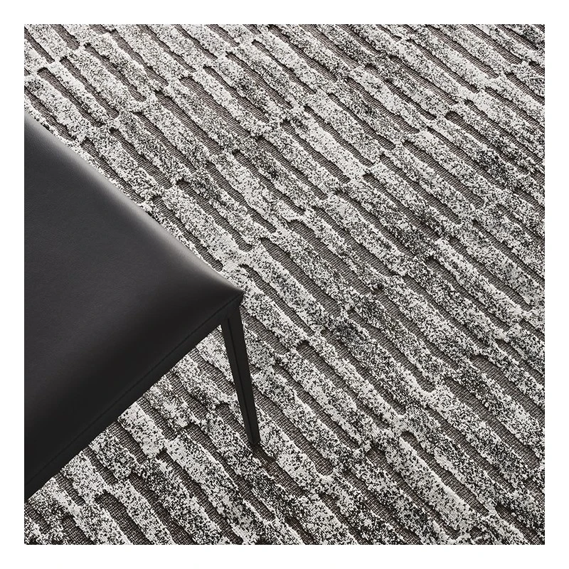 Tappeto tessuto in lana di base con disegno in rilievo in viscosa.