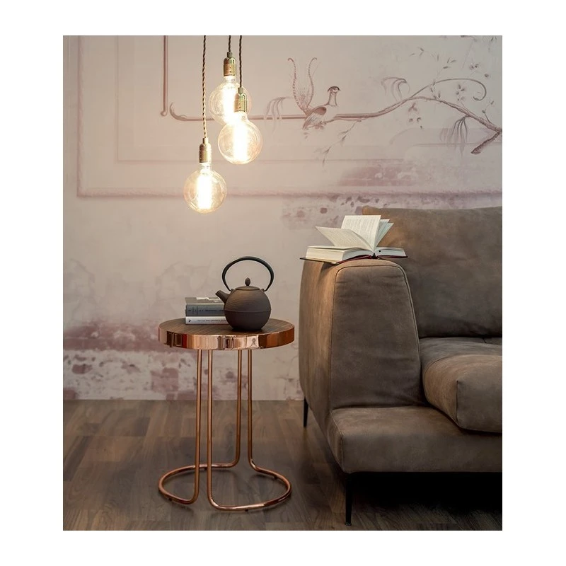 Un unico design per un tavolino o un più piccolo servetto; una struttura snella e affusolata, in cromo bronzato oppure ramato; un classico piano rivestito di noce o rovere scuro termotrattato: Cora.