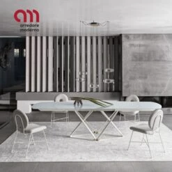 Il tavolo Delta di Bontempi Casa è realizzato con struttura e dettagli decorativi in diverse tonalità di acciaio laccato: