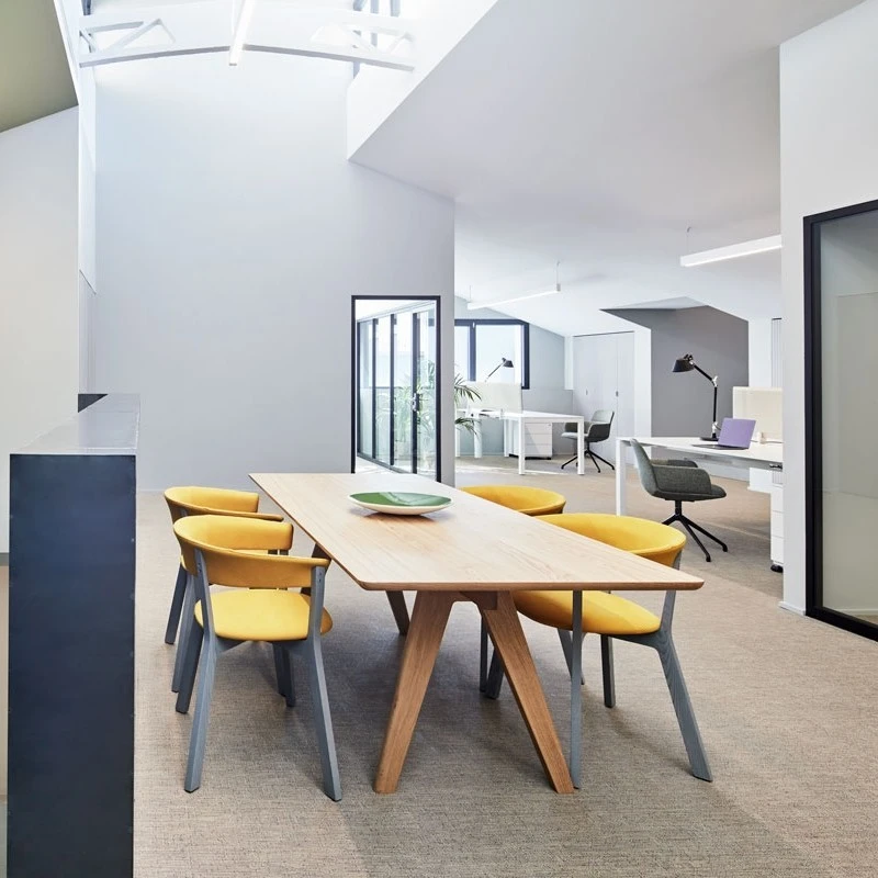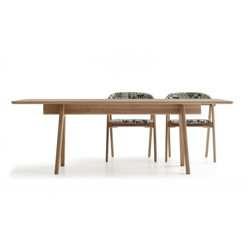 Mathilda è un tavolo moderno in senso architettonico, nel rapporto proporzionale tra l’insieme e il dettaglio. L’idea è semplice, perfetta per la funzione alla quale è riservata: due cavalletti conferiscono solidità e appartenenza, sorreggono la seduta prestandosi contemporaneamente come sostegni per lo schienale e come supporto impilabile. L’intuizione, ponderata e sobria, riporta il progetto nel contemporaneo, nella possibilità di evolvere verso un sistema di sedute coerente, funzionale e riconoscibile.