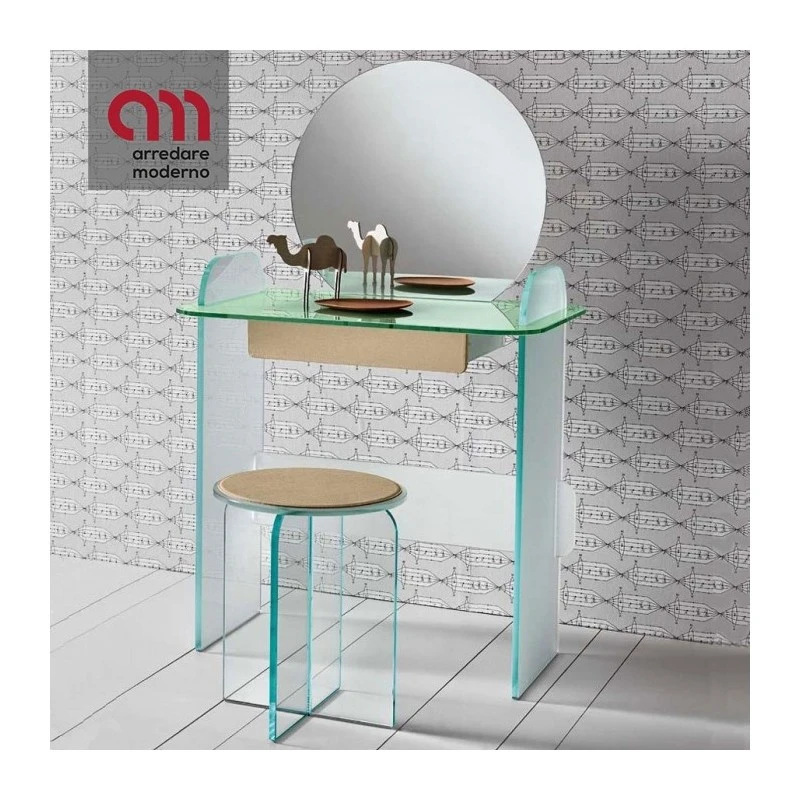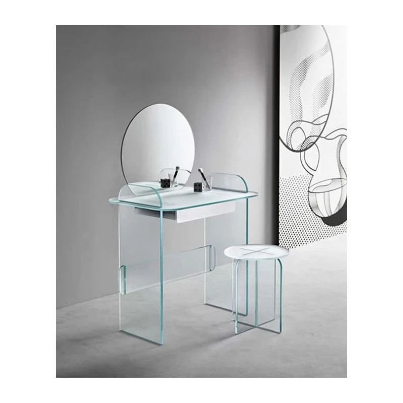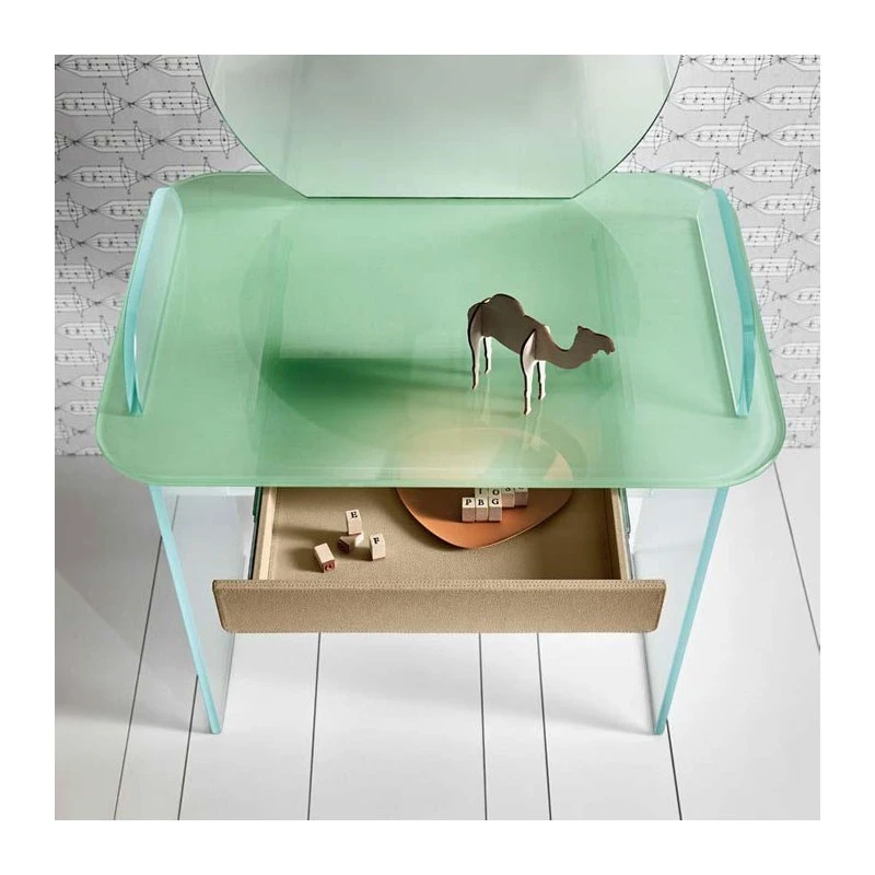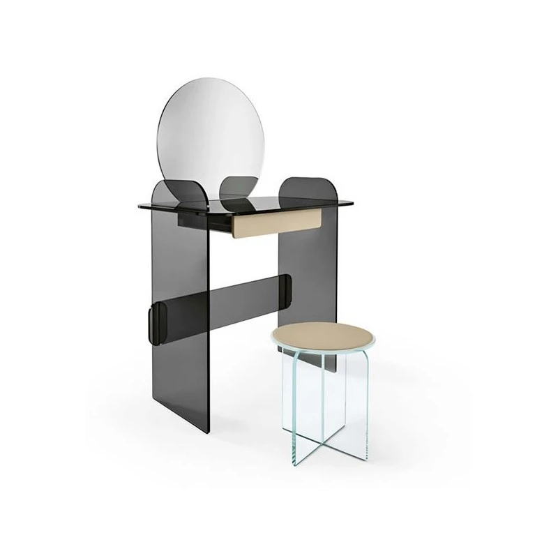 Toeletta con struttura in vetro extrachiaro satinato, opale verde o fumé, composta da specchio, piano d’appoggio e cassetto estraibile disponibile in bianco opaco o rivestito in pelle beige.